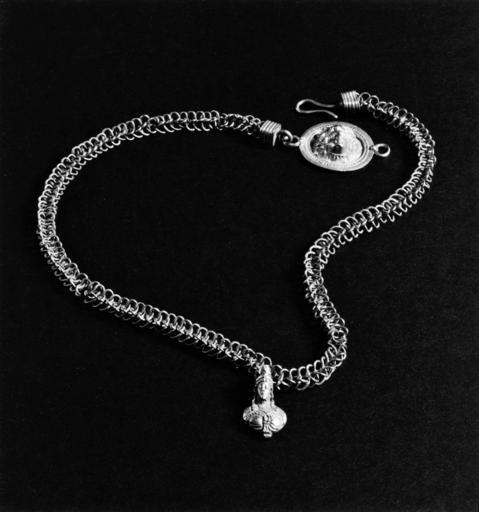 Keywords: Roman - Necklace with Pendant of a Female Bust and Head of Medusa or Helios on Clasp - Walters 57521.jpg The pendant on this chain link necklace is decorated with filigree and granulation century 2 gold cm 34 93 l ; pendant cm 2 diam accession number 57 521 13235 Collection of F G Hilton-Price date and mode of acquisition unknown Henry Walters Baltimore date and mode of acquisition unknown Walters Art Museum Henry Walters Acquired by Henry Walters Jewelry - Ancient to Modern The Walters Art Gallery Baltimore 1979-1980 place of origin Roman Empire Walters Art Museum license Ancient Roman art in the Walters Art Museum Jewellery in the Walters Art Museum Ancient Roman necklaces Media contributed by the Walters Art Museum needs category review |