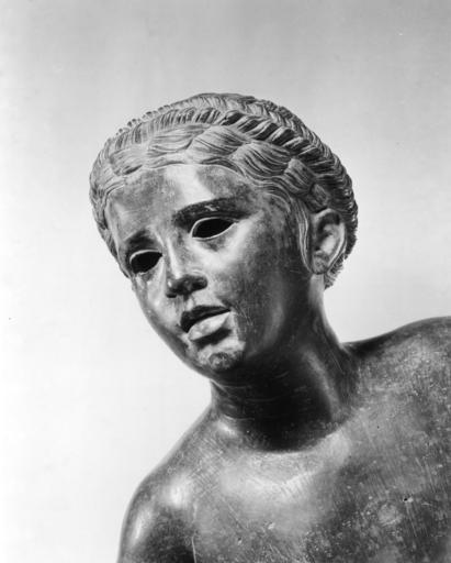 Keywords: Roman - Statue of a Boy - Walters 2371 - Detail B.jpg This is a masterful example of early Roman bronze statuary The proportions of the young boy in motion are not entirely in harmony indicating that it was made by the process of piece-mold casting In this technique artists joined different body parts together in varying combinations according to the desires of the patron Similar bronze figures carrying torches have been excavated from Roman villas around the Mediterranean and may have functioned as decorative lamp-holders or garden statuary century 1 bronze cm 115 5 54 6 22 8 accession number 23 71 22860 Marchese Aniello Palmieri Naples Dikran Kelekian Paris and New York Henry Walters city Baltimore Walters Art Museum Henry Walters Acquired by Henry Walters 1924 Fire of Hephaistos Large Classical Bronzes from North American Collections Harvard University Art Museums Cambridge; Toledo Museum of Art Toledo; Tampa Museum of Art Tampa 1996 place of origin south Italy Walters Art Museum license Roman bronze Statue of a Boy Walters 2371 Media contributed by the Walters Art Museum needs category review |