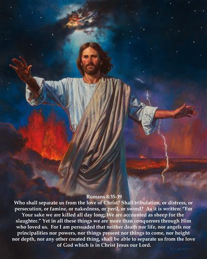 | Keywords: god jesus jesus christ jesuschrist god the father godthefather holy spirit holyspirit holy church scripture angels faith prayer pray hope peace love alive forevermore aliveforevermore angel christian righteous king of kings kingofkings heaven archangel god is love godislove prince of peace princeofpeace creator christ the creator christthecreator god the creator godthecreator third heaven thirdheaven awesome alpha and omega alphaandomega wonderful glorious omnipotent almighty bible holy bible holybible armor of god armorofgod glorify hallelujah judgment judgment day judgmentday usa united states of america unitedstatesofamerica sleep christ who strengthens me christwhostrengthensme word of god wordofgod word of god stands forever wordofgodstandsforever shine like stars shinelikestars the lord is my shepherd thelordismyshepherd eternity confess christ confesschrist confess repent repentance humble sinner humble yourself humbleyourself saved lost found salvation praise god praisegod amen word became flesh wordbecameflesh be strong bestrong courage spiritual warfare spiritualwarfare spiritual warfare New King James Version (NKJV) Who shall separate us from the love of Christ? Shall tribulation, or distress, or persecution, or famine, or nakedness, or peril, or sword? As it is written: “For Your sake we are killed all day long; We are accounted as sheep for the slaughter.” Yet in all these things we are more than conquerors through Him who loved us. For I am persuaded that neither death nor life, nor angels nor principalities nor powers, nor things present nor things to come, nor height nor depth, nor any other created thing, shall be able to separate us from the love of God which is in Christ Jesus our Lord. Romans 8:28 New King James Version (NKJV) And we know that all things work together for good to those who love God, to those who are the called according to His purpose. Artwork by Robert T Barrett: (Christ the Creator) roberttbarrett.com/ New King James Version (NKJV) Who shall separate us from the love of Christ? Shall tribulation, or distress, or persecution, or famine, or nakedness, or peril, or sword? As it is written: “For Your sake we are killed all day long; We are accounted as sheep for the slaughter.” Yet in all these things we are more than conquerors through Him who loved us. For I am persuaded that neither death nor life, nor angels nor principalities nor powers, nor things present nor things to come, nor height nor depth, nor any other created thing, shall be able to separate us from the love of God which is in Christ Jesus our Lord. Romans 8:28 New King James Version (NKJV) And we know that all things work together for good to those who love God, to those who are the called according to His purpose. Artwork by Robert T Barrett: (Christ the Creator) roberttbarrett.com/ |