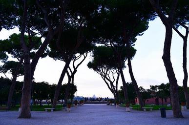 Keywords: rome alley park trees track bench coniferous tree city sun nature sunset journey landscape