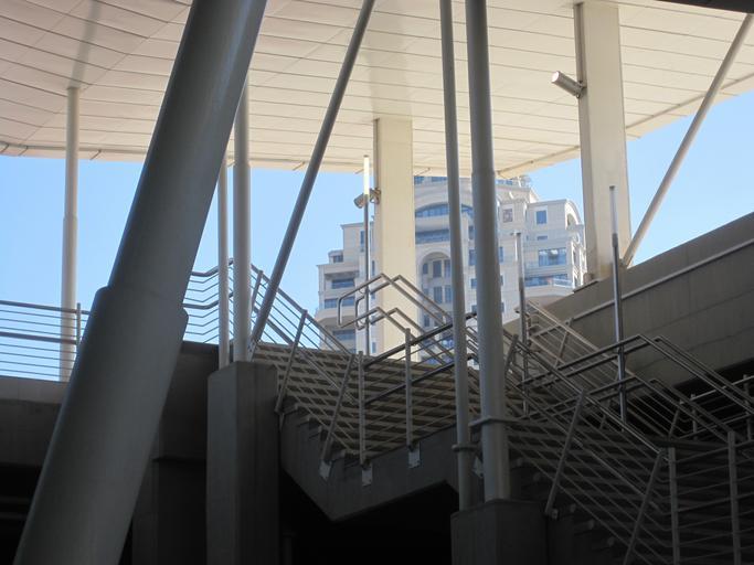 Keywords: roof railings poles uprights lines angles diagonals stairs slants sky