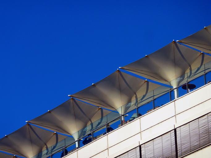 Keywords: roof terrace screens white blue outside catering gastronomy building table architecture facade
