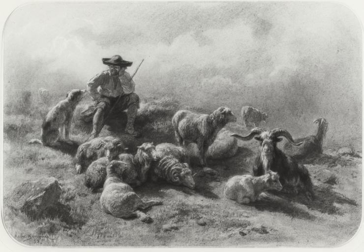 | Keywords: Rosa Bonheur - The Conversation - Walters 37907.jpg Bonheur's art was underpinned by detailed analytical study and she is known to have visited slaughterhouses and dissected animals to acquire an understanding of anatomy In the 1850s she also kept a collection of horses sheep and goats in her Paris studio for study purposes Later she kept an even larger menagerie including lions at her ch teau in By at the edge of the Forest of Fontainebleau where she moved in 1860 and lived for the rest of her life Rosa Bonheur Bordeaux 1997 This drawing shows a shepherd and his dog absorbed in their own private conversation They sit silhouetted against the light breaking through the clouds The drawing demonstrates Bonheur's ability to imbue her animals with near-human emotions Particularly prominent is the ram to the right with large curled horns which looks out at the spectator as does the sheep in the center which watches the viewer out of the corner of its eye The costume of the shepherd particularly his wide-brimmed hat suggests that the scene takes place in the Pyrenees which Bonheur had first visited in 1850 Thereafter she regularly represented the shepherds of the Pyrenees and their flocks including notably the Shepherd in the Pyrenees 1864 in the Musée Condé Chantilly 1858 charcoal heightened with white guache on blue/gray moderately thick heavily textured wove paper cm 36 9 55 2 accession number 37 907 17872 Goupil New York William T Walters Baltimore April 28 1860 by purchase Henry Walters city Baltimore Walters Art Museum Henry Walters Acquired by William T Walters 1860 Rosa Bonheur 1858 in lower right The Essence of Line A Connoisseur's Portfolio Lost and Found The Secrets of Archimedes The Walters Art Museum Baltimore 2011-2012 place of origin France Walters Art Museum license 2D A Connoisseur's Portfolio The Essence of Line Rosa Bonheur Drawings in the Walters Art Museum |