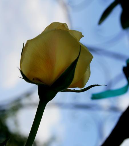 Keywords: rose bloom bud flower soft yellow light open petals soft delicate garden sky blue