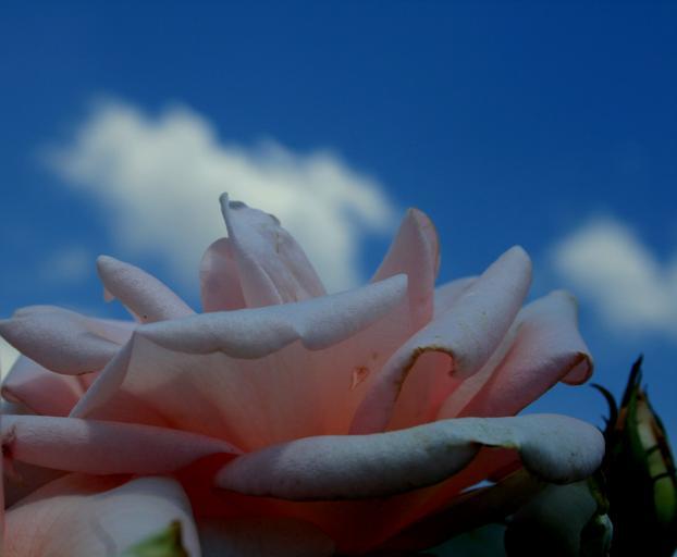 Keywords: rose flower bloom petals soft curved serene attractive pink garden sky blue clouds
