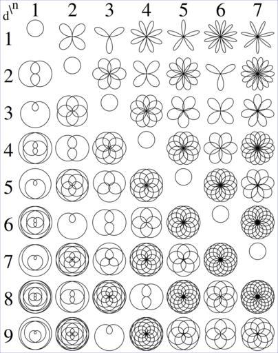 | Keywords: Rose-rhodonea-curve-7x9-chart.svg rose or rhodonea curves based on the polar-coordinates equation r sin θ n/d In this chart the values of parameter n varies from 1 to 7 while d varies from 1 to 9 Based on File Rose-rhodonea-curve-7x7-chart svg which was in turn inflenced by File Rhodonea_curve png but with the rows reversed in the layout of the chart This graphic converted from the following PostScript vector source code a slight modification of that used to produce File Rose-rhodonea-curve-7x7-chart svg <pre> 1 0 0 setrgbcolor 0 0 moveto 600 0 rlineto 0 760 rlineto -600 0 rlineto closepath stroke 0 setgray -4 681 translate/Times-Roman 28 selectfont 10 36 moveto d show 30 60 moveto n show 22 5 49 moveto \\ show/Times-Roman 42 selectfont 1 1 9 /d exch def 12 -18 moveto d 1 string cvs show 1 1 7 /n exch def gsave n 80 mul 0 translate d 1 eq -10 44 moveto n 1 string cvs show if 36 dup scale 01 setlinewidth 1 92 1 setrgbcolor 0 0 1 0 360 arc closepath fill 0 setgray n d gt /res n def /res d def ifelse/w d mul res div/th exch def th n mul d div/x exch def x sin th cos mul x sin th sin mul def 0 w moveto 1 1 360 res mul w lineto for stroke grestore for 0 -80 translate for showpage EOF </pre> Modification of File Rose-rhodonea-curve-7x7-chart svg Modification of by User Mankir of image by User AnonMoos 2009-10-25 Rose-rhodonea-curve-7x7-chart svg Rose curves Images with PostScript source code |
