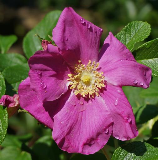 Keywords: rose rugosa rose rain-wet buds flower blossom bloom leaves garden nature plant