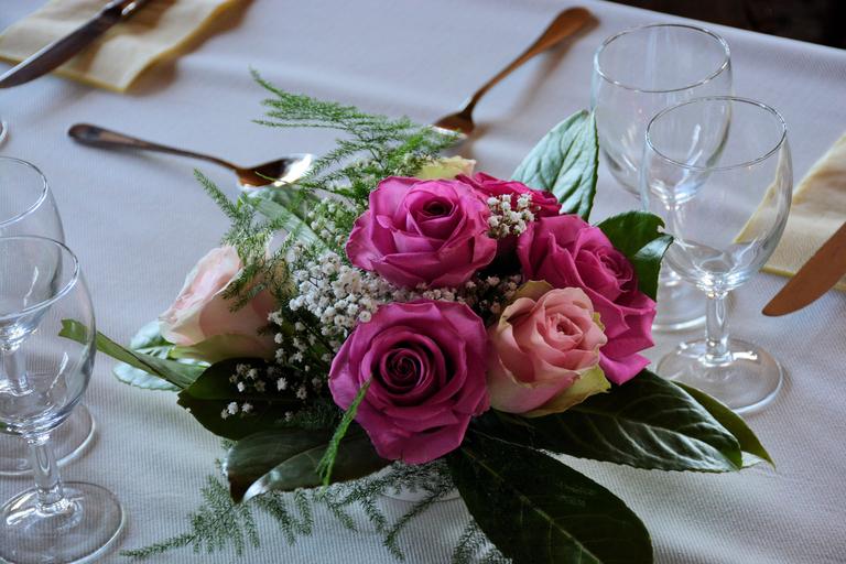 Keywords: roses bouquet of flowers table decoration flowers wine glasses