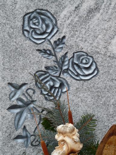 Keywords: roses tombstone stone chiseled grave flower black and white relief shadow mourning commemorate memory death loss grey