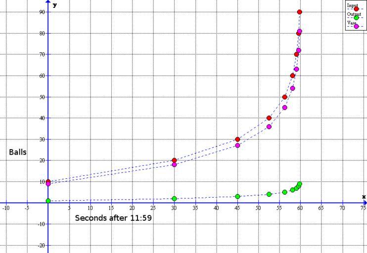 Keywords: Ross-littlewood-graph.png en A graph showing the growth of the number of balls put into remaining in and removed from the vase in the first ten iterations of the Ross-Littlewood problem with respect to time the one-minute span from 11 59 to 12 00 The change in the number of balls for each circumstance is linear with respect to number of iterations but exponential with respect to change in time The limit of each function approaches infinity as the time nears 12 00 suggesting an infinite number of balls both in and out of the vase at 12 00 2011-06-14 own Attys cc-zero Uploaded with UploadWizard Exponential functions Mathematical paradoxes Infinity |