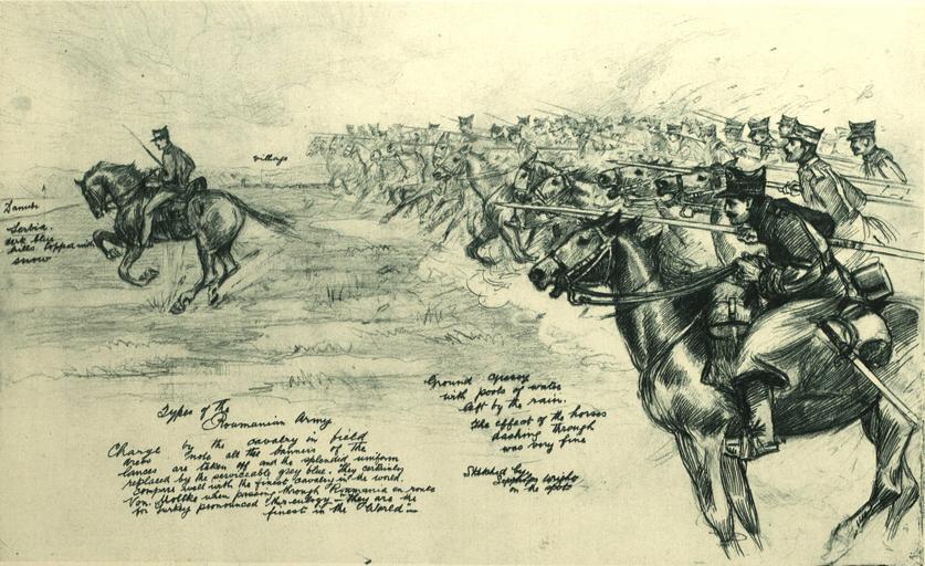 Keywords: Roumania's magnificent cavalery - Troopers of renown in the army of our new ally.jpg Roumania's magnificent cavalery - Troopers of renown in the army of our new ally <br> IN THE FIELD GREY OF MODERN WAR; NO BRILLIANT PEACE-TIME UNIFORMS OR LANCE-PENNONS ROUMANIAN CAVALRY CHARGING <br> In the popular regard of the nation the Roumanian cavalry are considered crack troops the ink of the service The men are good riders and of excellent physique are thoroughly disciplined and know their business They are well mounted on a first-rate type of horse native to the country Brilliantly uniformed in time of peace ”hardly the German or the Austrian hussars were more showily attired ”the Roumanian cavalry are now wearing the severely plain and stern-looking field-grey which all the Allied troops in the war have adopted where khaki is not worn Our artist sends this note recording an experience with the Roumanian cavalry on the day he made the above sketch There was some difference of opinion among certain officers as to whether the ordinary uniform or field-grey looked most impressive for cavalry from an enemy's point of view in a charge Two regiments the one attired in the peace-time uniform with fluttering pennons on their lances and the other in field-grey were turned out and ordered to charge so as to put the matter to a test I was asked to act as judge writes our war-artist and I gave my opinion in favour of field-grey The full-dress uniforms made a glittering display of colour but the field-grey troopers in the mass looked more formidable heavier and more sternly business-like as the onrush of horsemen swept by their lance-poles bare only tipped with gleaming points of steel --Drawing Copyrighted in the United States and Canada The Illustrated London News p 308 1916-09-09 Henry Charles Seppings-Wright 1850-1937 PD PD-art 1916 in Romania ILN 1916 Henry Charles Seppings-Wright Romania in World War I Participarea României la Primul Război Mondial reflectată în artă |