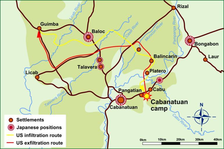 | Keywords: Route map of Raid at Cabanatuan.svg Map of the routes taken by the US Rangers in their Raid at Cabanatuan base maps ND 51-1 Tarlac and ND 51-2 Laur at http //www lib utexas edu/maps/ams/philippines/ US Army route information cite journal King Michael Rangers Selected Combat Operations in World War II June 1985 http //www cgsc edu/carl/resources/csi/csi asp PDF Leavenworth Papers 11 pp 59 60 Combat Studies Institute Kansas United States 0195-3451 2010-06-12 and cite book Rottman Gordon 2009 The Cabanatuan Prison Raid The Philippines 1945 Raid Osprey Publishing Oxford United Kingdom p 31 also on back cover 978-1-84603-399-5 http //books google com/books id 3FG4P65w5GYC The Ranger Approach March http //books google com/books id 3FG4P65w5GYC pg PA29 Raid 3 2010-06-12 marsh layout cite book Hogan Jr David 2004-10-30 U S Army Special Operations in World War II U S Army Center of Military History Washington D C United States p 87 141021690X http //www history army mil/books/wwII/70-42/70-42c htm Special Operations in the Pacific http //www history army mil/books/wwII/70-42/70-424 html 2010-06-12 compass File Blue compass rose svg 2010-06-12 Jappalang Raid at Cabanatuan |