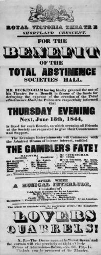 | Keywords: blackandwhite monochrome text outdoor black and white Arrangement of text, with the crest of the theatre at the top. Cast includes Mr Buckingham, Mr Jones, Mr Harold, Mr Brown, Mr Wilson, Mrs Thompson, Mr Young, Mr Serle, Mr Gray, Mr Dixon, M J Jonas, Mrs Harold, Miss Buckingham. Quantity: 1 b&w art print(s) on poster.. Physical Description: Relief print, on poster 555 x 222 mm. Royal Victoria Theatre, Shortland Crescent :For the benefit of the Total Abstinence Societies Hall. Mr Buckingham having kindly granted the use of his theatre ... the public are respectfully informed that Thursday evening next, June 13th 1844 ... the evening's entertainment will commence with the admired drama of intense interest, entitled "The Gambler's fate!" ... after which a musical interlude ... the whole to conclude with (by particular desire) the laughable farce of "Lovers quarrels!". 1844.. Ref: Eph-D-DRAMA-1844-01. Alexander Turnbull Library, Wellington, New Zealand. natlib.govt.nz/records/23105927 Arrangement of text, with the crest of the theatre at the top. Cast includes Mr Buckingham, Mr Jones, Mr Harold, Mr Brown, Mr Wilson, Mrs Thompson, Mr Young, Mr Serle, Mr Gray, Mr Dixon, M J Jonas, Mrs Harold, Miss Buckingham. Quantity: 1 b&w art print(s) on poster.. Physical Description: Relief print, on poster 555 x 222 mm. Royal Victoria Theatre, Shortland Crescent :For the benefit of the Total Abstinence Societies Hall. Mr Buckingham having kindly granted the use of his theatre ... the public are respectfully informed that Thursday evening next, June 13th 1844 ... the evening's entertainment will commence with the admired drama of intense interest, entitled "The Gambler's fate!" ... after which a musical interlude ... the whole to conclude with (by particular desire) the laughable farce of "Lovers quarrels!". 1844.. Ref: Eph-D-DRAMA-1844-01. Alexander Turnbull Library, Wellington, New Zealand. natlib.govt.nz/records/23105927 |