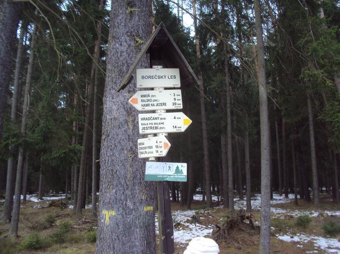 Keywords: Rozcestník Borečský les.JPG cs Rozcestník je v lese JZ od Mimoně own Zákupák 2013-04-06 Hiking and footpath fingerposts in Česká Lípa District