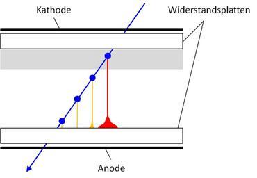 Keywords: RPC.png en RPC detectors consist of two gas enclosing layers of high-ohmic material resistive plates which are coated with copper cathode and anode on the outside A voltage difference accelerates electrons created via primary ionization blue dots of the gas by a charged particle blue arrow traversing the chamber to the anode where a signal is induced Only electrons that are created near the cathode grey area reach sufficient energy to induce a detectable signal indicated in red Thus primary ionization for detectable signals exclusively occurs within a small area near the cathode grey area de Schematischer Aufbau eines RPC-Detektors Zwei Widerstandsplatten resistive plates umschließen ein Gasvolumen An den Außenseiten befinden sich Elektroden zwischen denen eine hohe Spannungsdifferenz anliegt Tritt ein geladenes Teilchen blauer Pfeil in die Kammer ein werden Gasmoleküle ionisiert Primärionisation blaue Punkte Die langsamen Ionen driften zur Kathode die schnellen Elektronen zur Anode Lediglich diejenigen Elektronen die nahe der Kathode erzeugt wurden erhalten während der Drift ausreichend Energie um ein detektierbares Signal zu erzeugen in rot dargestellt Daher findet die Primärionisation für auslesbare Signale ausschließlich in einem kleinen Bereich nahe der Kathode statt grauer Bereich own Witten 2012-05-03 Particle detectors Cc-zero |