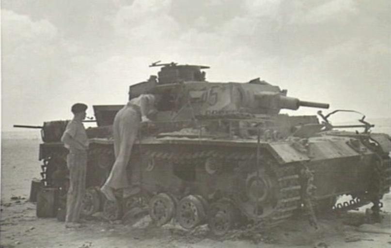 | Keywords: RSG officers inspect destroyed German tank (WWII).2.jpg en WESTERN DESERT EGYPT 1942-09-16 TANK OFFICERS OF THE ROYAL SCOTS GREYS INSPECTING DAMAGE DONE TO A GERMAN PZKFW III AUSF E MEDIUM TANK BY THEIR GENERAL GRANT M3 MEDIUM TANK Australian War Memorial author 1942-09-16 PD-Australia 025004 Royal Scots Greys World War II - Mediterranean Middle East and Africa Black and white photographs Panzerkampfwagen III during World War II | ||||