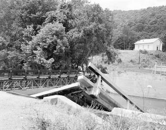 | Keywords: richmond va usa hurricane agnes hurricaneagnes virginia flood flooding natural disaster richmond va usa naturaldisasterrichmondvausa blackandwhite monochrome outdoor black and white The collapsed bridge on Rt. 639, near its intersection with Rt. 637, was replaced with a temporary H-10 type bridge. Located in Montgomery County, approximately 3 1/2 miles south of Shawsville. No. 72-1395, Virginia Governor's Negative Collection, Library of Virginia. The collapsed bridge on Rt. 639, near its intersection with Rt. 637, was replaced with a temporary H-10 type bridge. Located in Montgomery County, approximately 3 1/2 miles south of Shawsville. No. 72-1395, Virginia Governor's Negative Collection, Library of Virginia. |