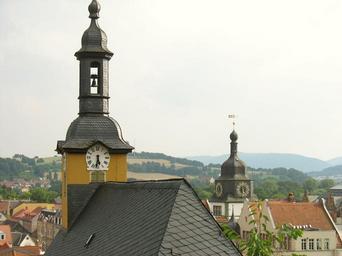 | Keywords: Rudolstadt clock towers.jpg en Rudolstadt Thuringia Germany Clock towers from the old council house Altes Rathaus left and from the Church of St Andreas Stadtkirche St Andreas right own Miguel Andrade 2009-07-01 Church clocks in Thuringia Churches in Rudolstadt |