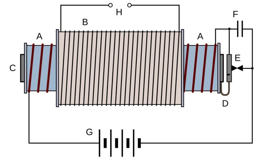 | Keywords: Ruhmkorff inductor schem.svg Induction coil Ruhmkorff coil circuit to generate high voltages The induction coil consists of a primary winding A of relatively few turns of coarse insulated wire and a secondary winding B of many turns of fine wire wrapped around an iron core C The battery G sends a DC current through the primary winding The interrupter E is pair of vibrating switch contacts which repeatedly breaks the primary current creating flux changes in the coil needed to induce a high voltage in the secondary coil The interrupter has an iron armature piece on a springy arm next to the coil's core When the current is switched on it creates a magnetic field in the iron core The iron interrupter arm is attracted to the core opening the contacts The primary current to the core is cut off the magnetic field collapses and the interrupter arm springs back closing the contacts again The primary current turns on again and the magnetic field attracts the arm again This cycle repeats rapidly 20 - 40 times per second Each time the primary current breaks and the magnetic field collapses it induces a voltage in the secondary winding Since the secondary winding has many turns the voltage is large large enough to cause a spark to jump across the spark gap H Small induction coils can create a 1 - 2 inch spark 40 to 80 thousand volts while large coils can can create sparks up to 40 inches about 1 million volts own based on File Ruhmkorffinductor svg public domain work of PieterJanR 2009-01-15 PieterJanR and Tescobar Ruhmkorff coil schematic 1 svg SVG electrical diagrams Induction coils |