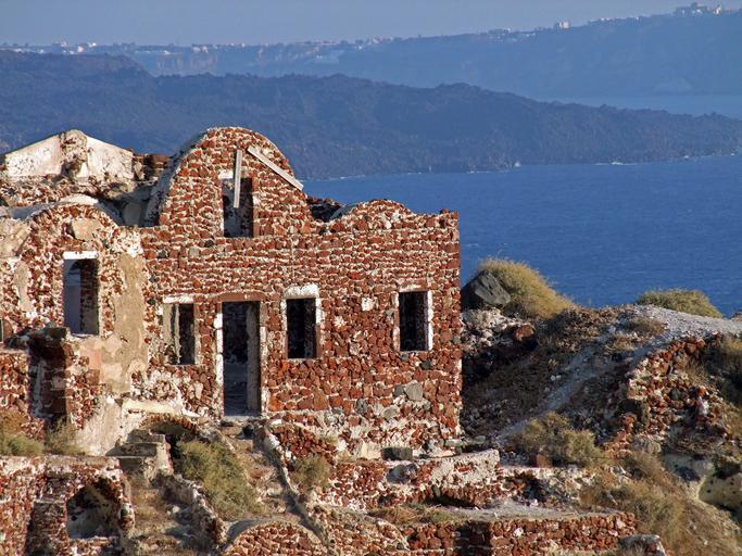 Keywords: ruin old lapsed wall red volcanic rock crater rim view viewpoint cyclades santorini oia greece high architecture sea island tourism holiday
