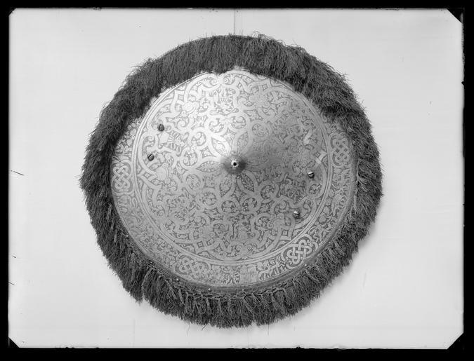 | Keywords: Rundsköld - Livrustkammaren - 14.tif LSH artwork sv Svagt konisk sköld mjukt övergående i konisk spets med rundad skadad ände med hål för knopp eller dyl Omvikt räfflad kant <br/><br/>Etsad yttäckande ornering i form av ytterst en ring b 70 mm med en löpande bildfris avbruten av sex 8-formiga fält med flätmönster Innanför ringen ett komplicerat flätmönster av 10 mm breda band allt mot prickad bakgrund <br/>Dekor i ringen fält 1 I mitten enhörning vänd v mot sittande kvinna som med h hand håller om mulen och med v hand om manen på enhörningen till v hund Till h om enhörningen två springande hundar och en stående man i lårkort dräkt i h hand hillebard Bakgrund i form av landskap med träd över enhörningen en fågel <br/>Fält 2 Landskap med till v jägare som lägger an bössa med trädstöd mot fågel fyra hundar till h drevkarl med spjut <br/>Fält 3 I mitten hus och därframför en ringlande väg till v man med bardisan två hundar till h stenbock och hund <br/>Fält 4 Landskap med träd i mitten vildsvin till h två hundar till v jägare med vildsvinsspjut och hund <br/>Fält 5 Landskap med träd till h björn vänd åt v över björnen en åt h flygande fågel i mitten två hundar till v stående man med v hand lyft blåser i jakthorn bakom mannen två hundar <br/>Fält 6 I mitten hjort till h man med fällt bardisanliknande spjut hund till v två hundar <br/><br/>Dekor på mittpartiet <br/>I rankverket utsparat sex sköldformiga fält med stående människor <br/>Sköld 1 Kvinna i rustning och långkjol profil v båda händer lyftade och hållande skål flygande band <br/>Sköld 2 Man i antikiserande rustning profil h stödjande sig på bardisan <br/>Sköld 3 Kvinna som i sköld 1 v arm håller palmblad som vilar på axeln h hand en på marken stående sköld <br/>Sköld 4 Man som i sköld 2 stödjer sig på ett yxliknande stångvapen <br/>Sköld 5 Kvinna som i sköld 1 i h hand yxliknande stångvapen <br/>Sköld 6 Man som i sköld 2 v hand stödjer sig på sköld <br/><br/>Bandflätningen löper mellan sköldarna samman i maskaroner banden nertill utgår ur munnen Ovanför maskaronerna fält med fåglar varav 2 ugglor nedanför maskaronerna utefter ytterringen delfiner I övrigt i de utsparade fälten rustningsdelar ibland i form av trofégrupper harar urnor mm <br/><br/>Innanför den räfflade kanten fäst en röd silkesfrans b ca 70 mm och därpå en i nätmönster flätad guldfrans Fransarna fästade med nitar med välvda mässingshuvuden <br/><br/>Två + två nithuvuden för bärremmarna höga svagt koniska huvuden med skruvskåra och filade linjer <br/><br/>Skölden invändigt klädd med rött mycket slitet läder På mitten fäst en rektangulär platta l 375 mm b 85-105 mm Därunder fäst dels handrem i form av rep klätt med läder samt en bred spännrem b ca 80 mm urspr med två spänntampar den yttre saknas En oval sölja av förgyllt stål fäst på läderrem l 75 mm b 30 mm På ena sidans nitar fäst bärrem b 30 mm o l ca 85 mm med likadan sölja som spännremmens söljremmens l 190 mm original caption rundsköld - LRK 9736 Erövringen av Warszawa Karl X Gustavs död och begravning ca other date - 1550 1600 steel - silk Färg röd material silke - gold thread - leather g 4050 size mm 585 120 LRK Karl VIII Knutsson Bonde av Sverige kung Wawel 1000-2000 2000 Eagle and Three Crowns 2002 Eagle and Three Crowns 2002 Örnen och de tre kronorna 2003 Krigsbyte 2007-2008 place of origin original filename LN_A00140_000140 45171 inventory number LRK 9736 14 CC0 Rundsköld - Livrustkammaren - 14-negative tif <gallery caption Different images of same object > File Rundsköld Italien 1500-talets andra hälft - Livrustkammaren - 44034 tif File Rundsköld - Livrustkammaren - 59939 tif </gallery> Funeral of Charles X Gustav of Sweden Media contributed by LSH unmatched event Media contributed by LSH unmatched objKeyword Shield images from Livrustkammaren Media contributed by LSH 2014-06 |