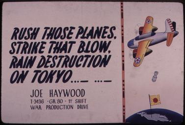| Keywords: Rush those planes. Strike that blow. Rain destruction on Tokyo. - NARA - 534740.jpg Scope and content General notes 534740 Local identifier 179-WP-889 Office for Emergency Management War Production Board 01/1942 - 11/03/1945 Still Picture Records Section Special Media Archives Services Division NWCS-S National Archives at College Park 8601 Adelphi Road College Park MD 20740-6001 other date circa 1942 1943 Record group Record Group 179 Records of the War Production Board 1918 - 1947 Record group ARC 508 War Production Board compiled 1942 - 1943 Series ARC 533858 File unit File unit ARC Variant control numbers NAIL Control Number NWDNS-179-WP-889 Other versions <gallery> File Rush_those_planes _Strike_that_blow _Rain_destruction_on_Tokyo _-_NARA_-_534740 tif tif File Rush_those_planes _Strike_that_blow _Rain_destruction_on_Tokyo _-_NARA_-_534740 jpg jpg </gallery> NARA-cooperation PD-USGov World War II posters from the United States |