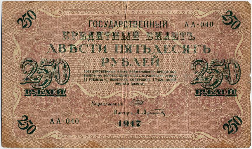 Keywords: Russia-1917-Banknote-250-Obverse.png Provisional Government of Russia banknote 1917 250 rubles obverse Госуда ственный к едитный билет В еменного п авительства России 1917 год 250 ублей лицевая сто она own <br /> Banknote is courtesy of collector who wants to remain anonymous Thank you Банкнота п едоставлена коллекционе ом пожелавшим остаться анонимным Спасибо 1917 Provisional Government of Russia PD-RusEmpire PD-old currency Banknotes of Russia 1917 Banknotes with a face value of 250 |