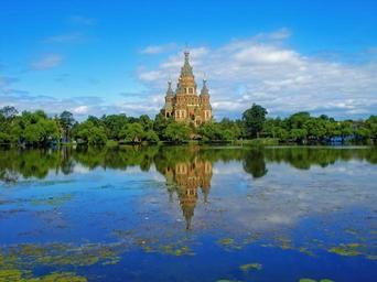Keywords: russia st petersburg russia peterhof temple sights church of sts peter and paul sky pond water reflection