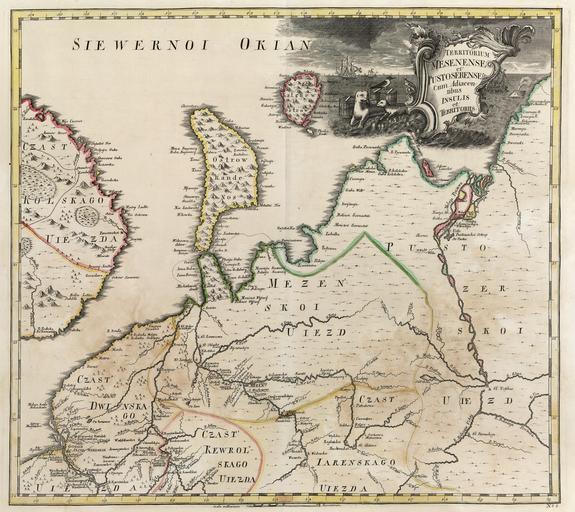 | Keywords: Russian Empire 1745 (Map VI in Latin).jpg Russian Empire 1745 Map V in Latin jpg Russian Empire 1745 Map VII in Latin jpg ru Пе вый официальный атлас Российской импе ии 1745 Ка та езенского и Пустоозё ского уездов с ближайшими ост овами и уездами а латинском языке О игинальная ка та г ави ована на меди и аск ашена в учную аква елью en First official geographic atlas of the Russian Empire 1745 Map of Mezensky and Pustoozersky uezds and nearest uyezds and islands in Latin Hand-coloured copper engraving Атлас Российский 1745 en Geographic atlas of the Russian Empire 1745 РА Russian Academy of Science 1745 <gallery> File Russian Empire 1745 Map VI HQ jpg Ка та на усском языке Same map in Russian File Russian Empire 1745 Map VI jpg Че но-белый ва иант на усском низкое качество Black white in Russian low quality </gallery> PD-old-100 Atlas of Russian Empire 1745 year in Latin |