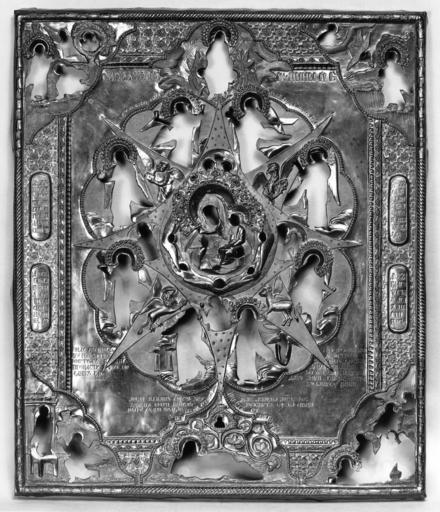 Keywords: Russian - Frame for Virgin of the Burning Bush - Walters 372478B.jpg This is a late example very conservative in painting style of a type of image that was first developed in Russia in the late 16th century It is primarily based on the Old Testament story in which God revealed himself to Moses in a bush that burned without being consumed by the fire The Burning Bush was used as a metaphor for the Virgin Mary who gave birth to a child while retaining her virginity The Virgin and Christ Child in the center of the panel are surrounded by the symbols of the four evangelists and by angels whom Mary as the Queen of Heaven commands These angels as the accompanying inscriptions explain hold sway over various natural elements wind fire ice darkness etc cf Hebrews 1 7 Four Old Testament scenes in the corners prophetically refer to the Incarnation Moses before the burning bush Exodus 3 2 Isaiah's vision of a cherub holding a coal with tongs Isaiah 6 6 Ezekiel's vision of a shut door through which the Lord alone can enter Ezekiel 44 2 and Jacob's dream of a ladder leading to heaven Genesis 28 12-13 In the frame below is the Virgin's ancestor Jesse father of King David century 19 Modern silver Mount cm 36 30 1 6 accession number 37 2478B 76790 Sara D Redmond Oyster Bay New York date of acquisition unknown by purchase Walters Art Museum Gift of Mrs Sara D Redmond 1972 place of origin Palekh Russia Walters Art Museum license Russian art in the Walters Art Museum Religious art in Russia Art of the Russian Orthodox Church Media contributed by the Walters Art Museum needs category review Madonna and Child |