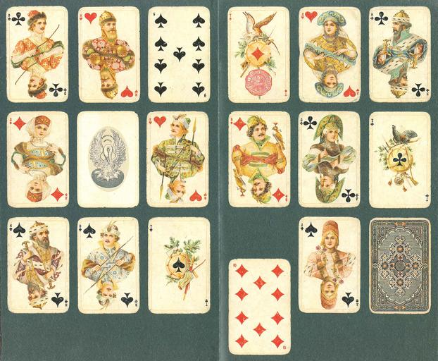 Keywords: Russian playing card deck Russian style 1911 original.png en Russian playing card deck called Russian style designed in 1911 by Dondorf GmbH Germany original print ru Иг альные ка ты «Русский стиль» 1911 год 1911 Пиковая дама Ка ты в жизни Жизнь в ка тах Соб ание Госуда ственного исто ического музея Художник и книга 2002 260 с ISBN 5-901685-19-9 Dondorf GmbH Germany other versions PD-old-70-1923 20th-century playing cards Russian national costumes |