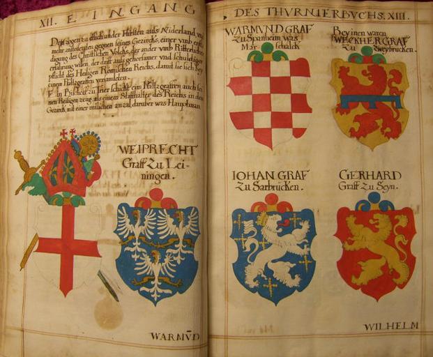 | Keywords: Rüxner Turnierbuch Abschrift 17Jh 26.jpg  Um Zusätze vermehrte Abschrift von Sigmund Feyerabends Frankfurter Ausgabe 1578/1579 des Turnierbuchs von Georg Rüxner Jörg Rugen Handschrift auf Papier in zwei Bänden 17 Jahrhundert <br /><br />Detail http //www neumann-walter de via ebay de century 17 anonymous PD-Art Rüxners Turnierbuch Abschrift 17 Jh Coats of arms of Sponheim family Coats of arms from Zweibrücken Coats of arms of Leiningen family Coats of arms of County of Saarbrücken Coats of arms of Sayn family Trier See coat of arms |