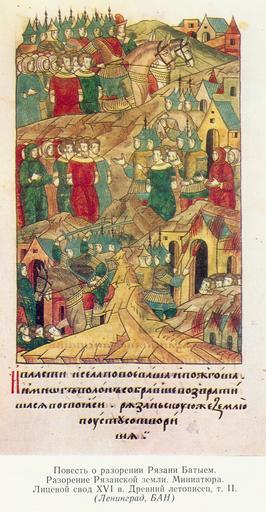 Keywords: RYAZAN.JPG ru Повесть о азо ении Рязани Батыем иниатю а Лицевой свод XVI в Д евний летописец т II Санкт-Пете бу г БА http //rutenica narod ru/batu html author XVI век PD-Art Mongol invasion of Rus Culture of Ryazan Oblast Facial Chronicle v 4 - Golytsinskiy tom 1114-1247; 1425-1472 1237 in Russia |