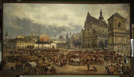 | Keywords: Rybkowski Targ przed Wielkanocą na placu Bernardyńskim we Lwowie w roku 1895.jpg 1895 oil on canvas Institution National Museum Warsaw object history exhibition history credit line accession number place of creation http //cyfrowe mnw art pl/dmuseion/docmetadata id 4984 show_nav true cyfrowe mnw art pl PD-old-70-1923 Uploaded with UploadWizard Tadeusz Rybkowski Soborna square Lviv | ||||