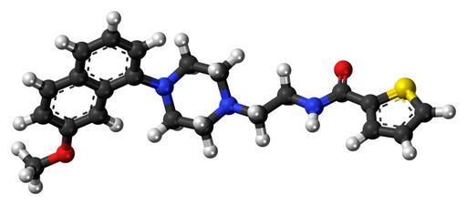 | Keywords: S-14,671-3D-balls.png Ball-and-stick model of the S-14 671 molecule a 5-HT<sub>1A</sub> receptor agonist Colour code 505050 Carbon C black<br> F0F0F0 Hydrogen H white<br> F51E1E Oxygen O red<br> 3C50FA Nitrogen N blue<br> FAEB00 Sulfur S yellow<br> 2011-05-29 own DS Visualizer Jynto talk Space-filling version cc-zero Piperazines Thiophenes Naphthol ethers Methyl ethers Naphthylamines N-substituted primary amides Images by Jynto | ||||