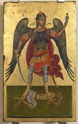 Keywords: S.Michael by A.Mitaras (17th c.).jpg Ο αρχάγγελος ιχαήλ 17ος αιώνας 36x44 5εκ Αντώνιος ηταράς Ο Α ρ Χ άγγελος ΙΧΑ ήλ ΧΕΙΡ Α ΤΩ ΙΟΥ ΤΟΥ ΗΤΑΡΑ Στην εικόνα αριστάνεται ο αρχάγγελος ιχαήλ σε ένα εικονογραφικό τύ ο γνωστό στην μεταβυζαντινή ζωγραφική Ο άγγελος φοράει στρατιωτική εξάρτυση έχει γυμνό σ αθί στο δεξί χέρι ατάει σε μισόγυμνο άντρα ου βρίσκεται ξα λωμένος στο έδαφος και με το αριστερό του χέρι κρατάει την ψυχή του τελευταίου ου έχει τη μορφή σ αργανωμένου βρέφους http //eib xanthi ilsp gr/gr/icons asp cursort iconTitle selectFieldValue vpage 3 century 17 Anthonios Mitaras Files uploaded by Shakko from various sources PD-old Icons of archistrateg Michael Cretan School 17th-century icons of Greece Taking the souls in Christianity |