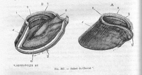 Keywords: SabotCvChauveau1890MeyCh.jpg en The horse Equus caballus hooves fr Le sabot du cheval Equus caballus A vu de haut en bas B après ablation de la moitié de la paroi <br />-1 périople -2 cavité cutigérale -3 kéraphylle -4 paroi -5 passage du périople à la gaine de la fourchette -6 face interne de la sole -7 union de la sole avec la paroi -8 arête de la fourchette <br /> ” Chauveau Auguste Arloing Saturnin Traité d'anatomie comparée des animaux domestiques <br /> 1 064 p page 914 1890 Paris Lib J B Baillière et Fils domaine public décès des auteurs 1917 et 1911 Meyer Ch 2011-03-29 PD-old Anatomy of horse hooves |