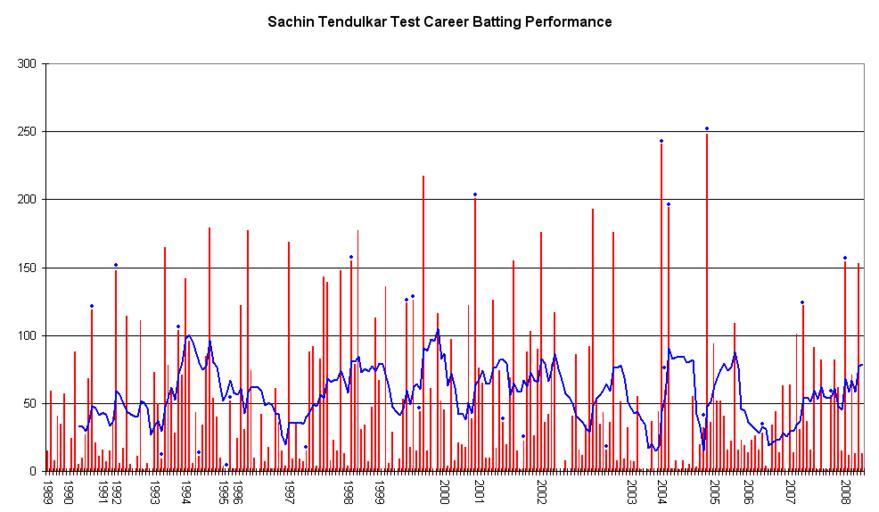 | Keywords: Sachin Tendulkar graph.png Sachin Tendulkar graph svg Test Match performance of Sachin Tendulkar It was created by Raven4x4x The red bars indicate the player's test match innings while the blue line shows the average of the ten most recent innings at that point Note that this average cannot be calculated for the first nine innings The blue dots indicate innings in which Tendulkar finished not-out This graph was generated with Microsoft Excel 2002 using data from Cricinfo http //stats cricinfo com/statsguru/engine/player/35320 html class 1;orderby start;template results;type batting;view innings and Howstat http //www howstat com au/cricket/Statistics/Players/PlayerProgressBat asp PlayerID 1735 The information in this chart is current as of 2 February 2008 2008-02-02 Own Raven4x4x wikipedia en derivative versions Sachin Tendulkar graph svg gallery 200 3 File Sachin Tendulkar graph svg SVG version also updated to include all innings upto 24 January 2012 Raven4x4x Original upload log page en wikipedia Sachin_Tendulkar_graph png 2008-02-02 07 46 Raven4x4x 986×574 7151 bytes <nowiki>This graph details the Test Match performance of Sachin Tendulkar It was created by Raven4x4x The red bars indicate the player's test match innings while the blue line shows the average of the</nowiki> Sachin Tendulkar Test cricketers graphs of India |