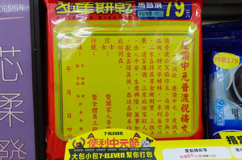 | Keywords: Sacrificial Writing for Ghost Festival on Package of Peacock Biscuit 20160724.jpg zh-tw 孔 餅乾包 上的慶讚中元普渡 禱文, 於統 超商鑫壽 市(146964) 2016-07-24 19 58 58 own 玄史生 other versions Ghost Festival in Taiwan Kuai Kuai Confectionery of Taiwan 玄史生写 文庫 Taken with Nikon Coolpix A cc-zero |