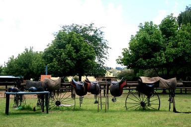 Keywords: saddles leather horse riding post wagon wheels green trees sky