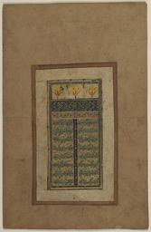 Keywords: Sadi1.jpg Script nasta'liq These calligraphic fragments are the first seven pages of Sa'di's Bustan The Fruit Garden or The Orchard The order of the first seven pages of this work all belonging to the same manuscript goes as follows Page 1 1-04-713 19 26 Page 2 1-04-713 19 15 Page 3 1-04-713 19 14 Page 4 1-04-713 19 12 Page 5 1-04-713 19 13 Page 6 1-04-713 19 11 Page 7 1-04-713 19 25 Page 1 Shaykh Sa'di d 691/1292 composed his famous and beloved Bustan in 1256-7 It contains histories personal anecdotes fables and moral instructions The first page provides a praise of God as an appropriate incipit to the text The first two lines read In the name of the Lord Life-Creating / The Wise One Speech-Creating with the Tongue / The Lord the Giver the Hand-Seizing / Merciful Sin-Forgiving Excuse-Accepting As in this case the first page of a Persian poetical text is easily recognizable as it is provided with an ornamental panel at the top sarloh and the main text usually is decorated by cloud band motifs and decorative illumination between the text and in the gutter separating each verse of poetry The top frieze contains three yellow flowers -- perhaps intended to represent blooming saffron flowers although the petals of saffron flowers tend to be of a light purple color -- as well as a blue horizontal band decorated with a gold leaf and flower motifs The yellow-orange flower reappears on an otherwise unrelated calligraphic fragment in the Library of Congress see 1-88-154 41 V This copy of the Bustan may have been produced in India during the 17th century The back of the second page 1-04-713 19 15 of this series includes a note supporting this provenance as it states that the work was written by 'Abd al-Rashid Daylami He was one of the famous calligraphers active at the court of the Mughal ruler Shah Jahan r 1627-1656 in Agra and Delhi ascs 009 century 17 Calligrapher 'Abd al-Rashid Daylami attr PD-old Other pages in this set <gallery> File Sadi2 jpg Page 2 File Sadi3 jpg Page 3 File Sadi4 jpg Page 4 File Sadi5 jpg Page 5 File Sadi6 jpg Page 6 File Sadi7 jpg Page 7 </gallery> Bostan Cloud bands |