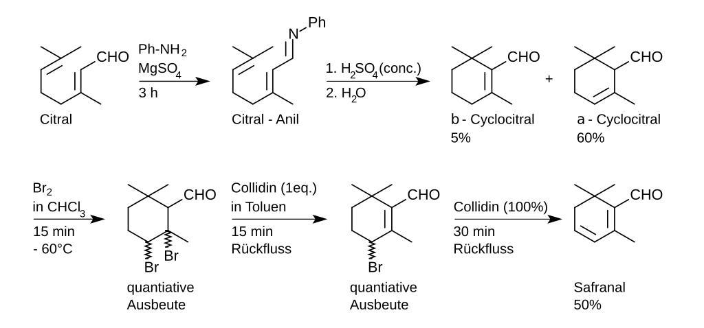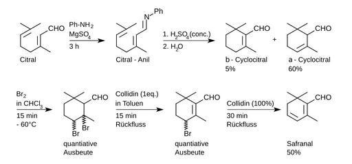 Keywords: Safranal synthesis.svg Synthesis of Safranal starting from Citral <br> according to W M B Könst L M van der Linde and H Boelens Tetrahedron Letters 15 36 1974 pp 3175-3178 Own 2009-06-28 Joël Gubler alias Talos public domain Organic syntheses |