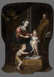 | Keywords: Sagrada Familia con San Juan Niño. Obra anónima del siglo XVIII. (Museo de Bellas Artes de Córdoba).jpg La obra representa a los tres miembros de la Sagrada Familia cristiana junto al niño San Juan Bautista y es una obra anónima del siglo XVIII y/o de algún seguidor del pintor Antonio del Castillo y Saavedra Siglo XVIII oil on canvas Size cm 106 146 5 Institution Museo de Bellas Artes Córdoba http //ceres mcu es/pages/Main accession number http //ceres mcu es/pages/Main PD-old-100 Paintings of Holy Family with John the Baptist Paintings of Holy Family in Spain 18th-century paintings of Holy Family Paintings of saints in the Museum of Fine Arts of Córdoba 18th-century paintings in the Museum of Fine Arts of Córdoba |