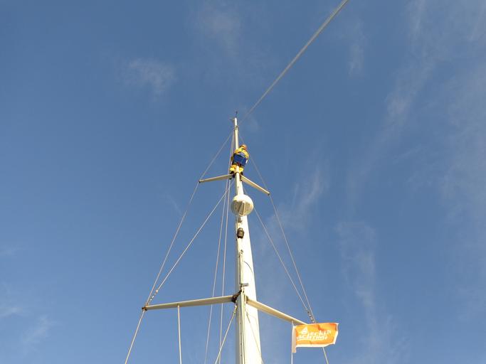 Keywords: sail mast leash repair perch wind sky summer sun sea sport risk adventure fear courage height