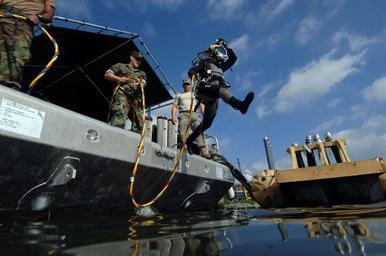 Keywords: Sailors dive in Providence River DVIDS101575.jpg en Petty Officer 3rd Class Kevin Vagaski U S Navy diver assigned to Mobile Diving and Salvage Unit 2 leaps into the cold and murky waters of the Providence River beginning a dive on the sunken former Soviet submarine Juliett 48 MDSU-2 U S Army divers and a NAVSEA support unit are preparing to salvage the former Soviet submarine that sank at her mooring point in about 30 feet of water during a noreaster which struck Providence in April of 2007 This training exercise is part of the DoD Innovative Readiness Training program 2008-06-19 https //www dvidshub net/image/101575 080619-N-+++++-039 2008-07-09 04 06 PROVIDENCE RI US PD-USGov-Military-Navy United States Navy Mobile Diving and Salvage Unit Two Images from DoD uploaded by Fæ |