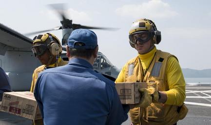 Keywords: Sailors load relief supplies an MV-22B Osprey aircraft. (26474871861).jpg KUMAMOTO Japan April 19 2016 Aviation Boatswain's Mate 3rd Class Ryan Moats left and Aviation Boatswain's Mate Airman Connor Brady load supplies onto an MV-22B Osprey aircraft from Marine Medium Tilitrotor Squadron VMM 265 attached to the 31st Marine Expeditionary Unit 31st MEU in support of the Government of Japan's relief efforts following earthquakes near Kumamoto The long-standing alliance between Japan and the U S allows U S military forces in Japan to provide rapid integrated support to the Japan Self-Defense Force and civil relief efforts U S Navy photo by Mass Communication Specialist 3rd Class Gabriel B Kotico/Released 160419-N-AE545-386 Join the conversation http //www navy mil/viewGallery asp www navy mil/viewGallery asp http //www facebook com/USNavy www facebook com/USNavy http //www twitter com/USNavy www twitter com/USNavy http //navylive dodlive mil navylive dodlive mil http //pinterest com pinterest com https //plus google com plus google com https //www flickr com/photos/usnavy/26474871861/ Sailors load relief supplies an MV-22B Osprey aircraft 2016-04-19 00 00 https //www flickr com/people/56594044 N06 Official U S Navy Page from United States of America MC3 Gabriel B Kotico/U S Navy Attribution License IPTC Caption-Abstract U S Navy photo PD-USGov-Military-Navy Official U S Navy Imagery https //flickr com/photos/56594044 N06/26474871861 2016-04-20 15 31 18 cc-by-2 0 160419-N-AE545-386 Navy 2016 Kumamoto earthquake relief efforts JS Hyƫga DDH-181 Photographs taken on 2016-04-19 United States Forces Japan Files from the U S Navy Flickr stream |
