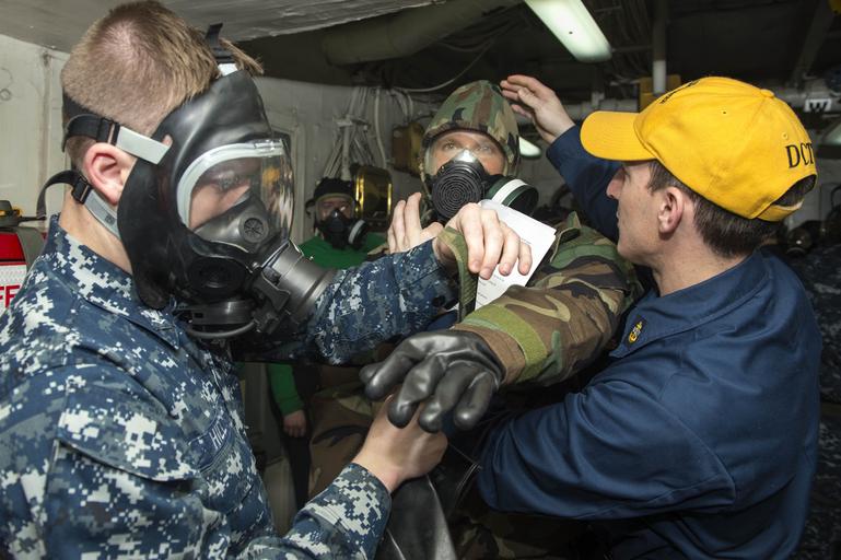 | Keywords: Sailors put on personal protective gear during a CBR drill. (8577550374).jpg  RED SEA March 19 2013 Aviation Electronics Technician 3rd Class Jonathan S Hill and Chief Aviation Electronics Technician Byron D Tims help Aviation Electronics Technician 3rd Class Matthew A Beanblossom put on his personal protective equipment and MC2P gas mask during a chemical biological and radiological general quarters drill aboard the aircraft carrier USS Dwight D Eisenhower CVN 69 Dwight D Eisenhower is deployed to the U S 5th Fleet area of responsibility promoting maritime security operations theater security cooperation efforts and support missions as part of Operation Enduring Freedom U S Navy photo by Mass Communication Specialist Seaman Andrew Schneider/Released 130319-N-XQ474-043 Join the conversation http //www facebook com/USNavy www facebook com/USNavy http //www twitter com/USNavy www twitter com/USNavy http //navylive dodlive mil navylive dodlive mil https //www flickr com/photos/usnavy/8577550374/ Sailors put on personal protective gear during a CBR drill 2013-03-19 06 32 https //www flickr com/people/56594044 N06 Official U S Navy Page from United States of America PD-USNavy Official U S Navy Imagery https //flickr com/photos/56594044 N06/8577550374 2016-12-14 04 41 09 United States Government Work Naval ships of the United States Files from the U S Navy Flickr stream Files uploaded by Reguyla People of the United States Navy |