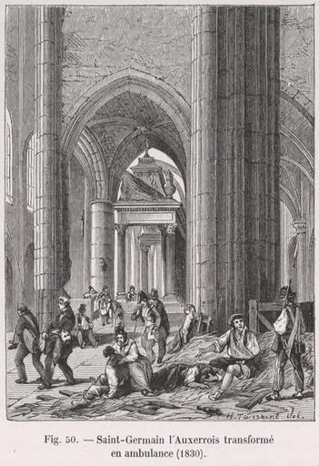 | Keywords: Saint-Germain l'Auxerrois transformé en ambulance, 1830.jpg  Artwork An 1830 portrayal of Saint-Germain l'Auxerrois which was used to care for the wounded during the July Revolution Although this church was nearly abolished in the years to follow protesters insisted on its historical meaning and symbolism and it was eventually restored 1875-1882 lithograph 10 4 x 7 8 cm Institution Brown University Library object history exhibition history credit line Published in Theodor Josef Hubert Hoffbauer Paris à travers les âges Paris Firmin-Didot et cie 1885 accession number 1172175858649850 PD-old Lithographs of Paris Images of Paris from the Brown University Library Paris à travers les âges Historical images of Église Saint-Germain-l'Auxerrois Military hospitals in France French Revolution of 1830 |