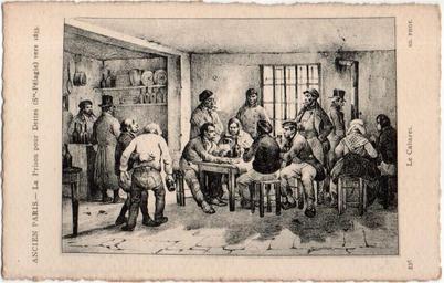 | Keywords: Sainte-Pélagie. 1835.jpg author LangSwitch In one room evoking a gambling den men are seated others standing converse One of them is a bottle by hand A portion of the part is devoted to storage has vaissele The set is pretty miserable and the only window has bars Dans une pièce évoquant un tripot des hommes sont attablés d ™autres devisent debout L ™un d ™entre eux debout mais soutenu par un compagnon a une bouteille à la main Une partie de la pièce est consacrée au rangement de a vaissele L ™ensemble est assez miséreux et la seule fenêtre comporte des barreaux ~ 1835 LangSwitch draw on a postcard dessin sur une carte postale place of discovery object history exhibition history credit line LangSwitch out of the draw en dehors du dessin fr LangSwitch out of the draw en dehors du dessin fr accession number place of creation http //www delcampe fr/page/item/id 393583969 var 75--PARIS-ANCIEN-PARIS-LA-PRISON-POUR-DETTES-SAINTE-PELAGIE-VERS-1835--Ref-n16706- language F html Delcampe Anonymous-EU Prison Sainte-Pélagie |