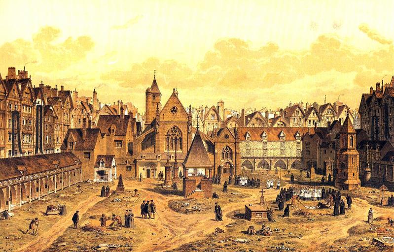 | Keywords: Saints Innocents 1550.jpg en Engraving depicting the Saints Innocents cemetery in Paris around the year 1550 end of 19th century File Saints Innocents 1550 Hoffbauer jpg Th Hoffbauer PD-Art Uploaded with UploadWizard Cimetière des Innocents Paris in the 16th century |